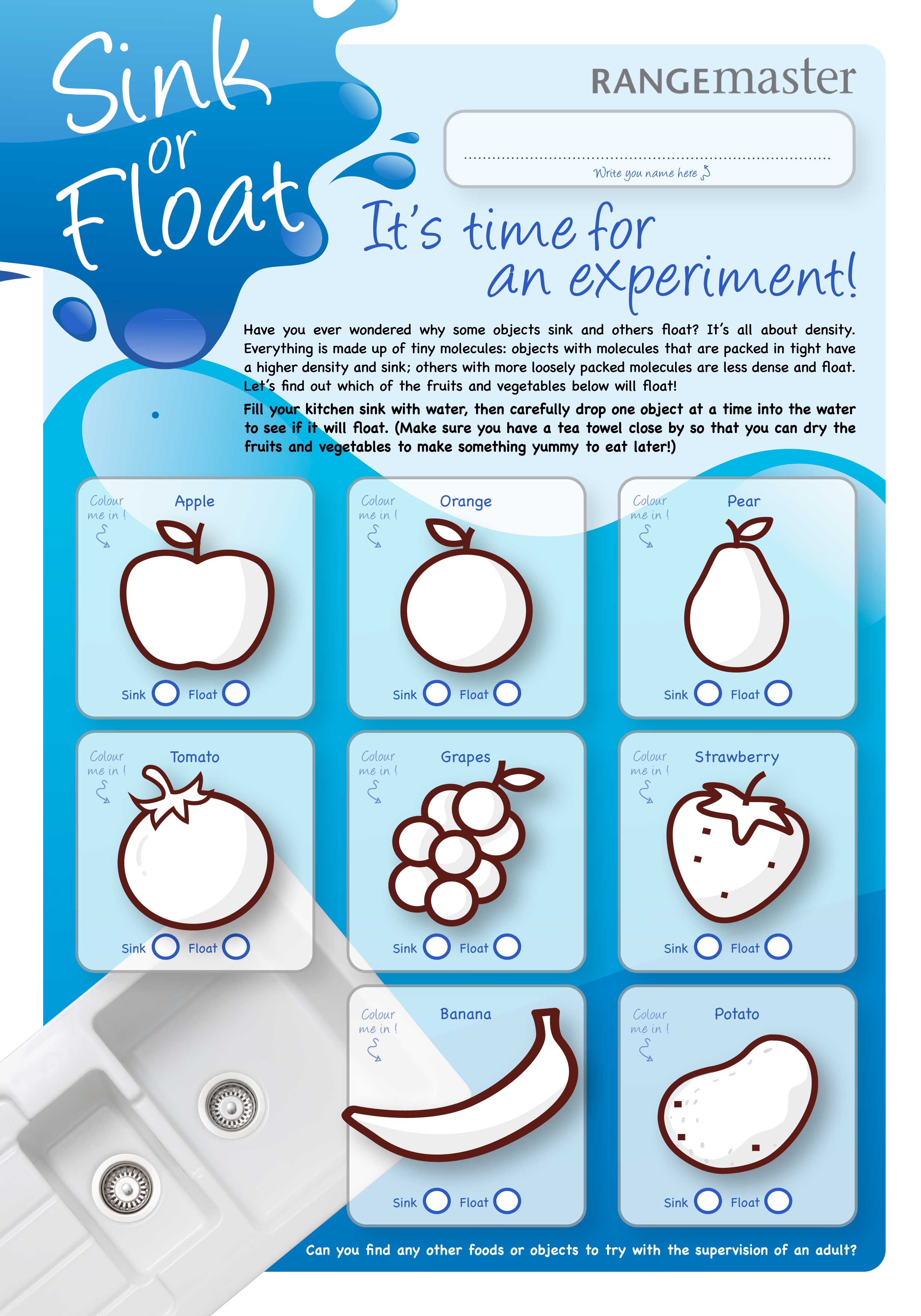 Will it float or sink? A bin or sink filled with water, . Let kids discover density, buoyancy, and the properties of water. Does it sink or float? This sink or float experiment and worksheet are a great way to get the kids learning in a hands on way and then recording what happens.